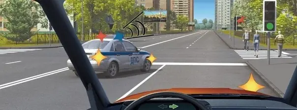 Вы пытаетесь повернуть направо из крайней правой полосы, но на полосе слева полицеская машина пытается так же повернуть. Надо ли вам её пропускать?
