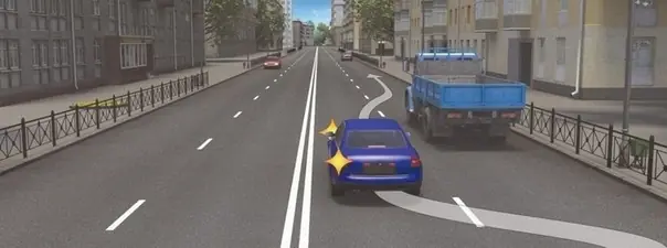 Легковое авто пытается обогнать грузовик. Для это водитель перестраивается в левую полосу и включает левый поворотник. Когда его надо будет выключить?