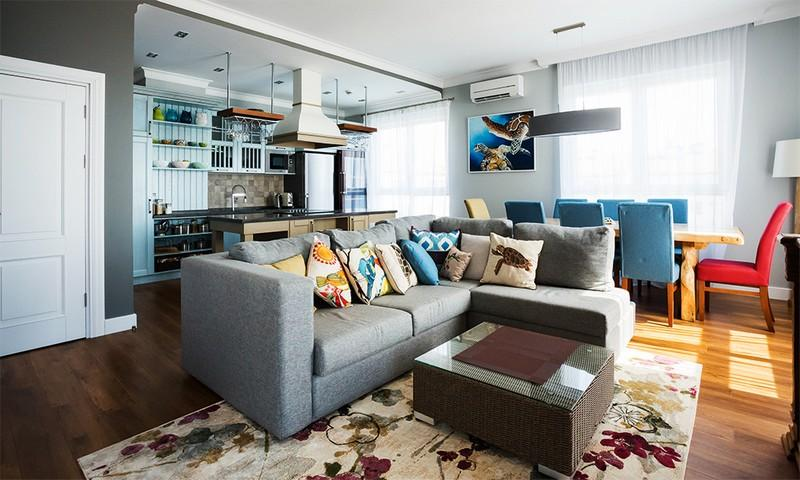 В квартире современный дизайн и планировка. Было принято решение объединить кухню с гостиной. В роли некой границы между двумя зонами играет диван. На полу значится ламинат. Стены и потолок окрашены в серый и белый цвета.