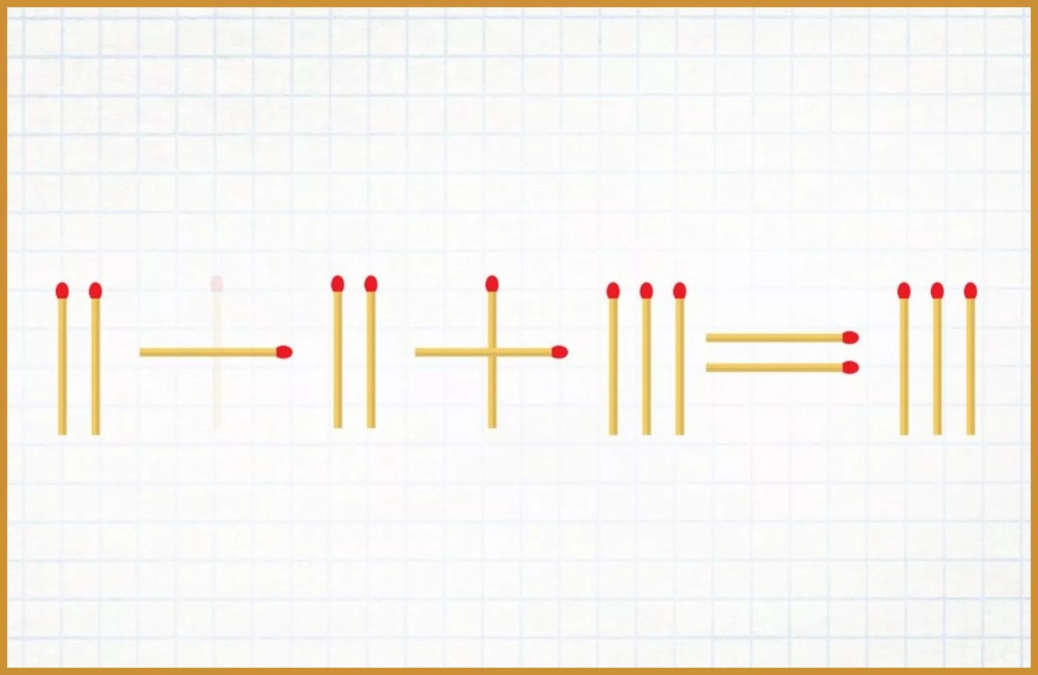 Нам нужно было превратить сложение в вычитание. Что делать с лишней спичкой? Нужно добавить ее к единице. Таким образом, мы получим 2. И вуаля! Наше равенство наконец-то стало верным.