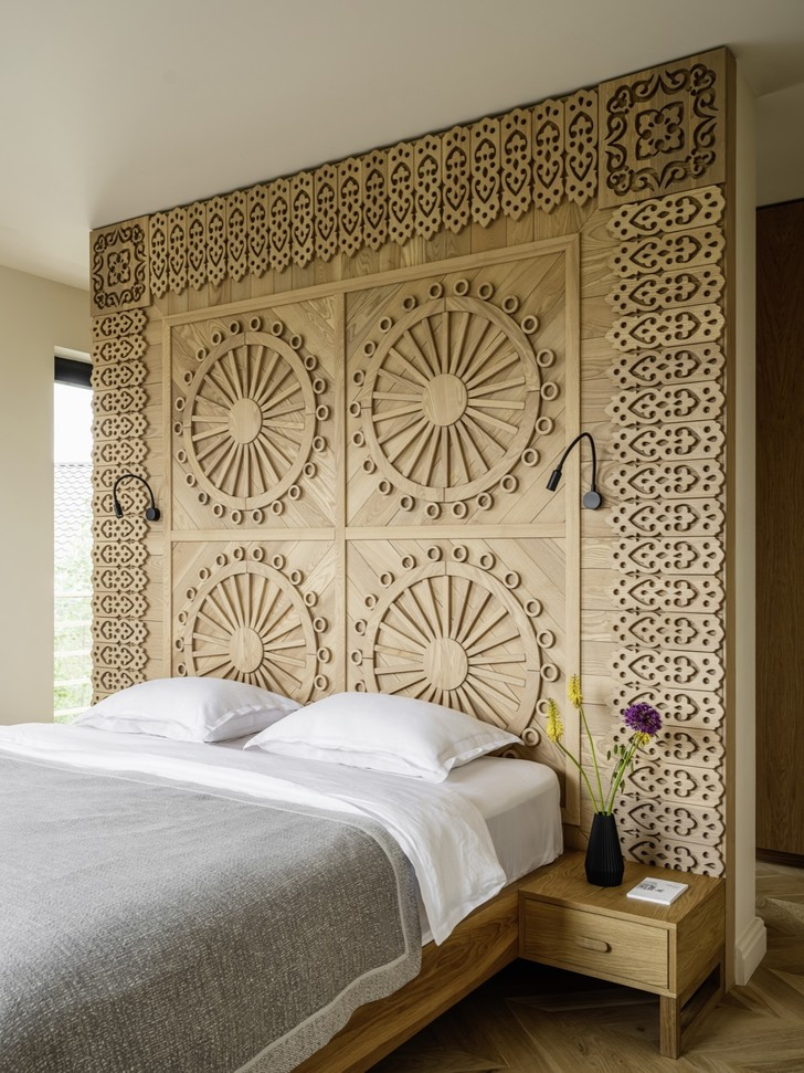 При оформлении внутреннего убранства было принято решение придерживаться природных мотивов. Вся мебель дизайнерская и выполнена из дерева. В комнатах много природного декора.