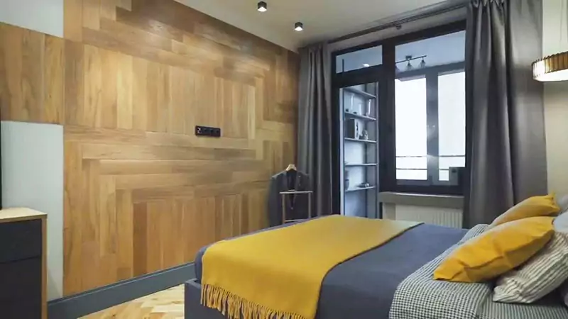 Спальня отделена от кухни и гостиной с помощью стеклянной перегородки. Здесь преобладают серый и желтый цвет. Паркет есть даже на стене.