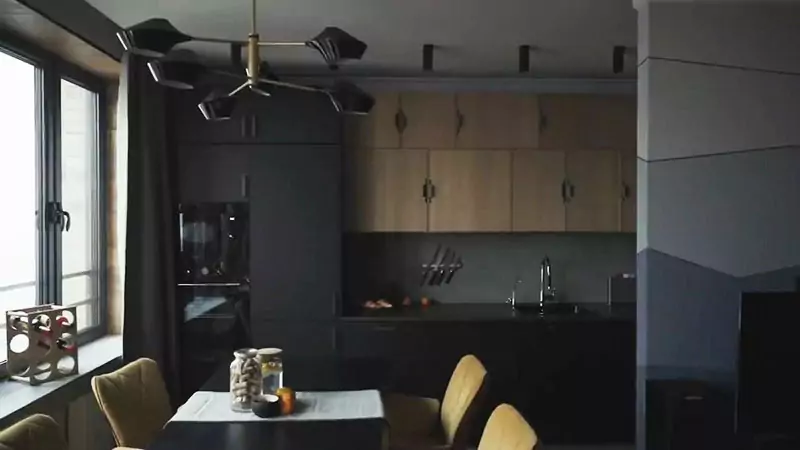 Кухня объединена с гостиной и столовой. Однако зональность сохранена за счет цветов. Артист решил выбрать мебель для кухни из МДФ. Сама кухня небольшая и явно не предполагает частых приготовлений блюд.