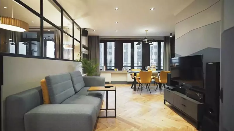 Вся квартира выполнена в стиле минимализм, но с яркими оттенками. На полу в гостиной значится классический паркет из натурального дерева. А потолок натяжной.
