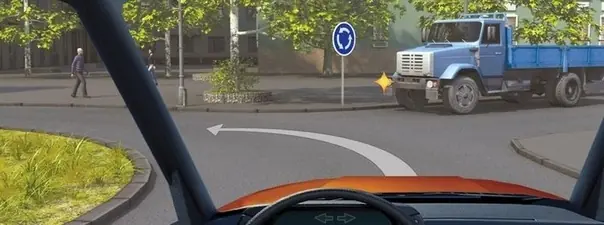 Вы уже едете по кольцевому перекрёстку, но на него хочет заехать грузовик. Надо ли вам его пропускать?