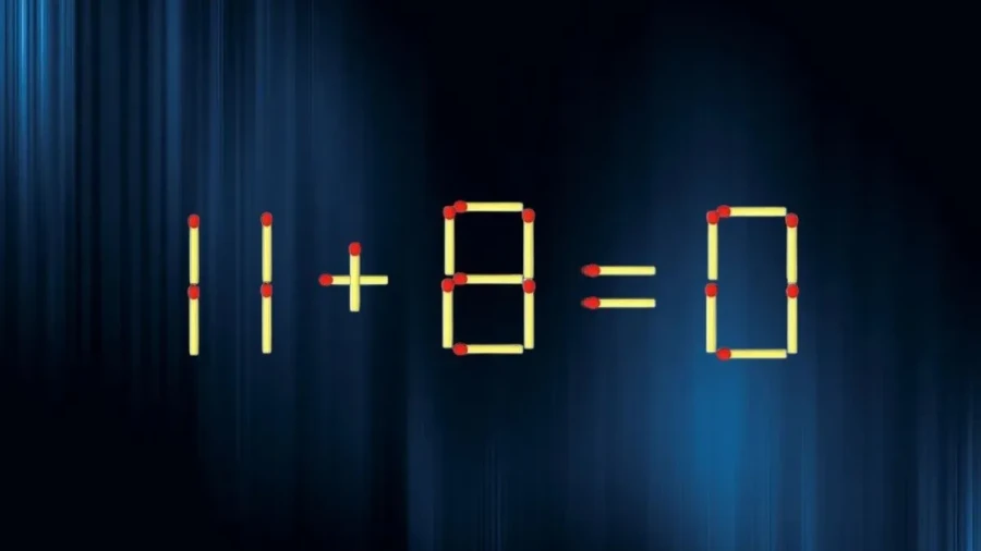 На картинке вы видите пример «11+8=0». Здесь специально заложена ошибка, и вся задача сводится к тому, чтобы передвинуть лишь одну спичку и всё исправить.