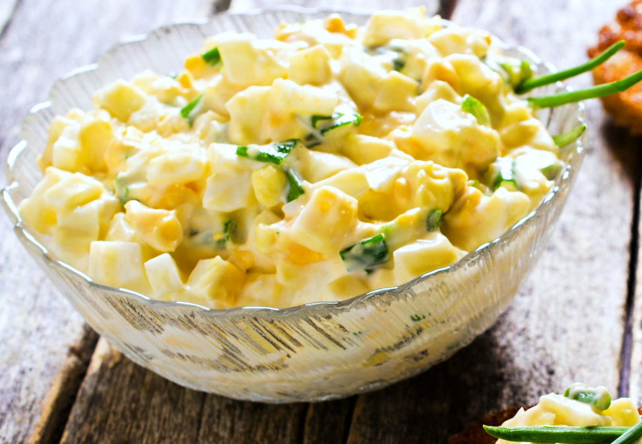 Основой салата-минутка явлются простые бюджетные продукты. Главный его ингредиент — яйца. Нам не потребуется предварительно готовить продукты. Сходу начинаем собирать в салатницу.