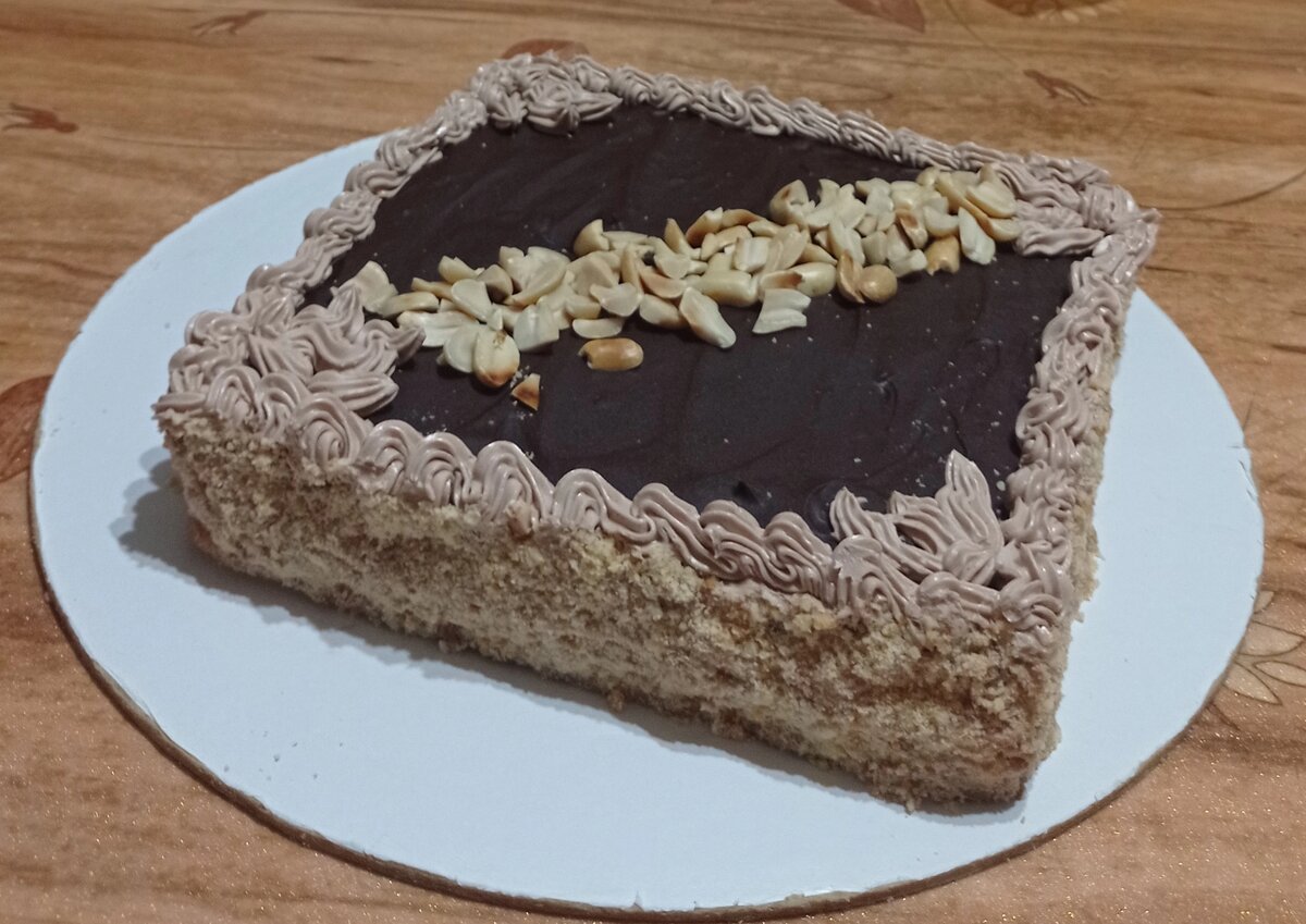 Сборка торта происходит стандартным способом. Три коржа необходимо промазать любым джемом на ваш вкус. Даем остыть. Наносим крем на корж. Выкладываем следующий корж и снова наносим крем. Сверху укладываем последний корж, который покрыт сахарной глазурью. Бока покрываем оставшейся частью крема. Украшаем торт арахисом. Оставляем десерт на 3-4 часа в холодильнике.
