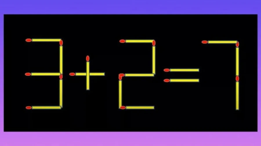 На картинке видно пример: 3+2=7. Всё вроде бы правильно написано, только равенство неверное. Нужно всего лишь передвинуть одну спичку, чтобы исправить ситуацию.