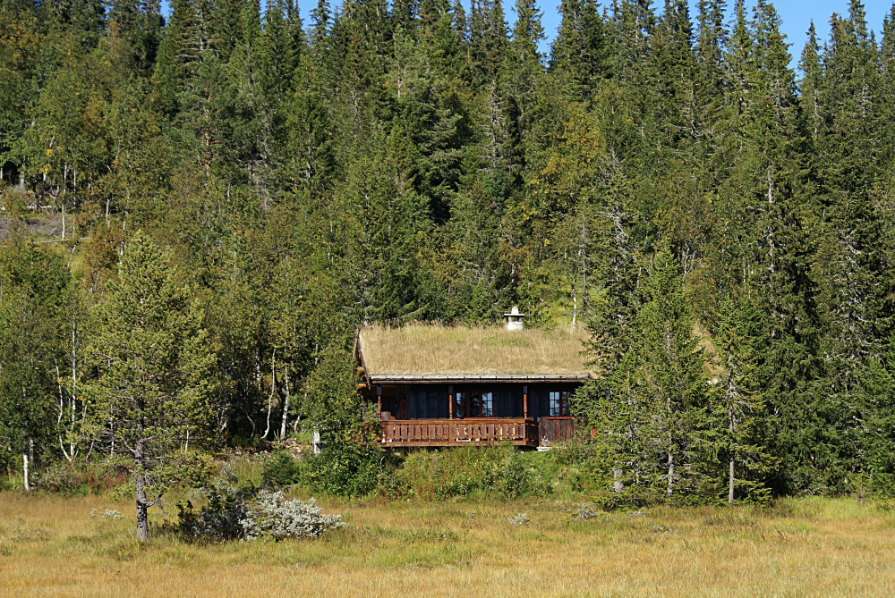Доски, которыми обшит фасад, имеют темно-коричневый оттенок, а потому сливаются с окружающими деревьями.