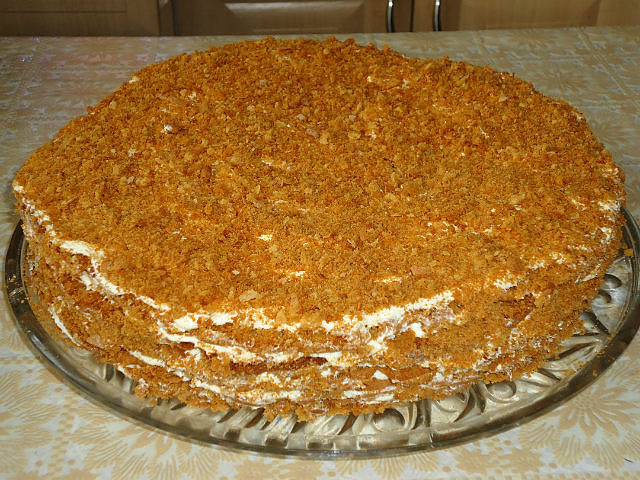 Корж смазываем кремом и сворачиваем в рулет. Сверху обсыпаем крошкой от обрезков. Отправляем в холодильник на час, чтобы наш медовик остыл. Теперь можно подавать к чаю.