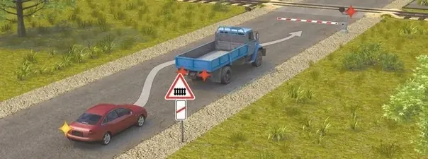Водитель должен остановиться позади грузовика и дождаться открытия шлагбаума. Безопасность на переездах всегда в приоритете.