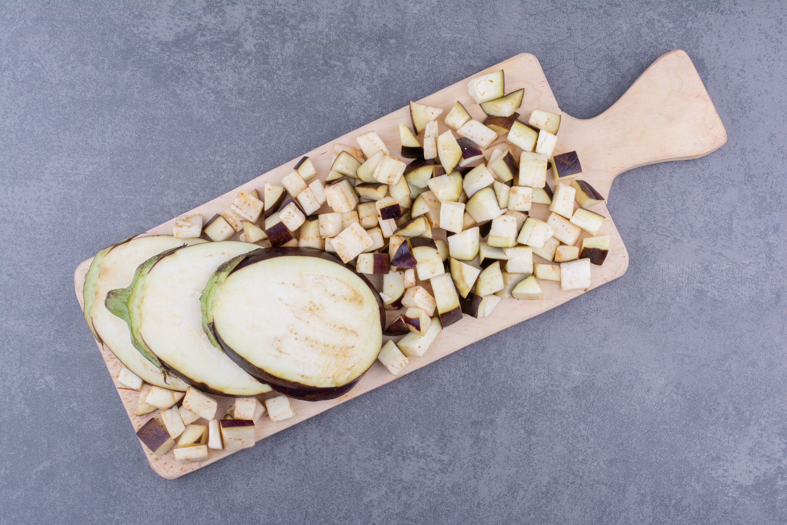 3 баклажана чистим от кожуры и режем крупным кубиком. 3 яйца взбиваем с половиной чайной ложки соли и немного перчим. Баклажаны заливаем яичной смесью и перемешиваем.