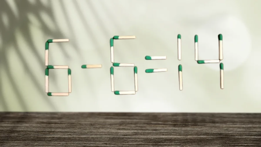 Перед вами иллюстрация со спичечным примером «6-6=14». В нём допущена ошибка, которую можно исправить, переместив всего две детали. Остальные элементы трогать не нужно.