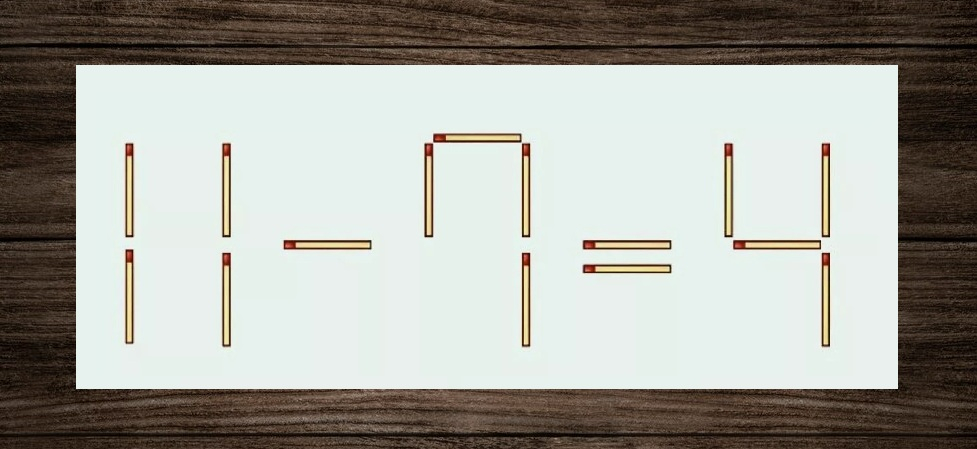 Чтобы получилось все верно, нам нужно исправить слагаемое слева. Переместив палочку из первой «11», можно превратить его в «7». Если все сделали правильно, то у вас получится «11-7=4».