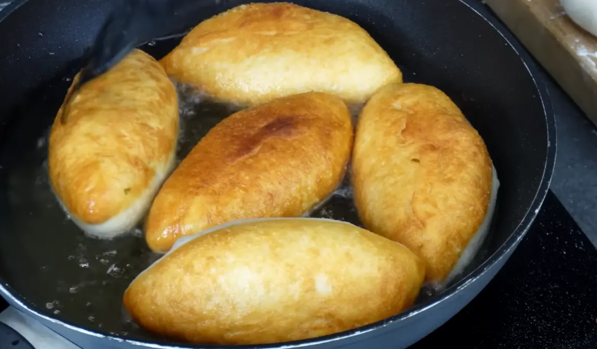 Формируем лепешку, закладываем начинку и защипываем. Заливаем растительное масло в сковородку и начинаем жарить пирожки. Вот и весь процесс готовки пирожков.