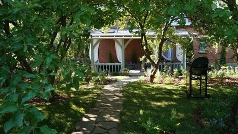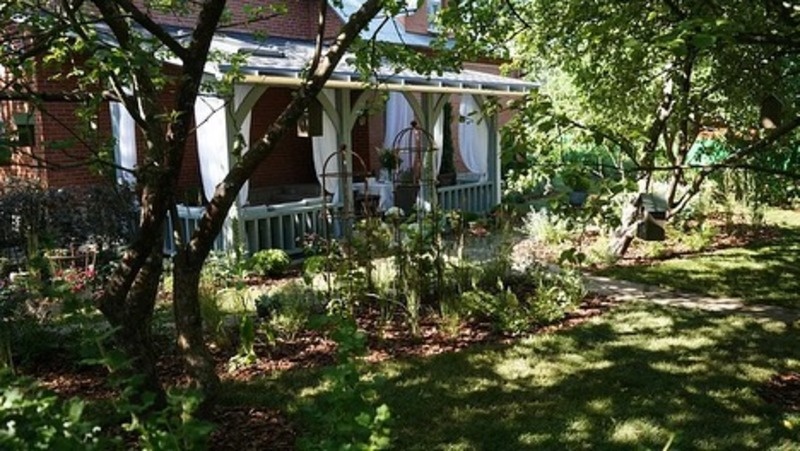 Сад у веранды тоже выполнен в британском стиле. Садовые дорожки покрыты плиткой серо-зеленого оттенка. Саду специально придали некую небрежность.