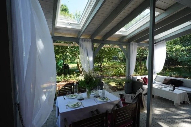 Было принято решение вместо беседки продлить навес дома и создать террасу. Конструкция выпонена в английском стиле. Отметим нежные невесомые занавески и уютную садовую мебель.