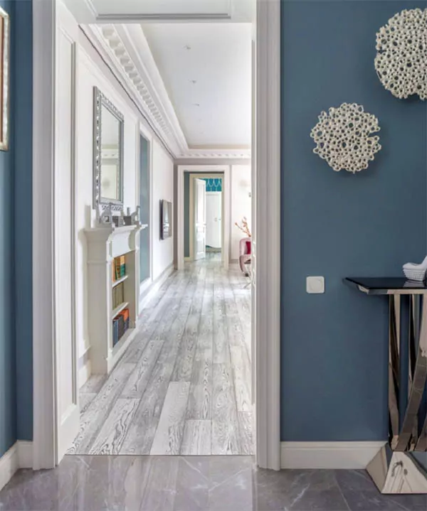 Атмосфера яркости и света начинается сразу с коридора. Стены здесь окрашены в глубокий сине-серый цвет. На полу установлен мраморный кафель.