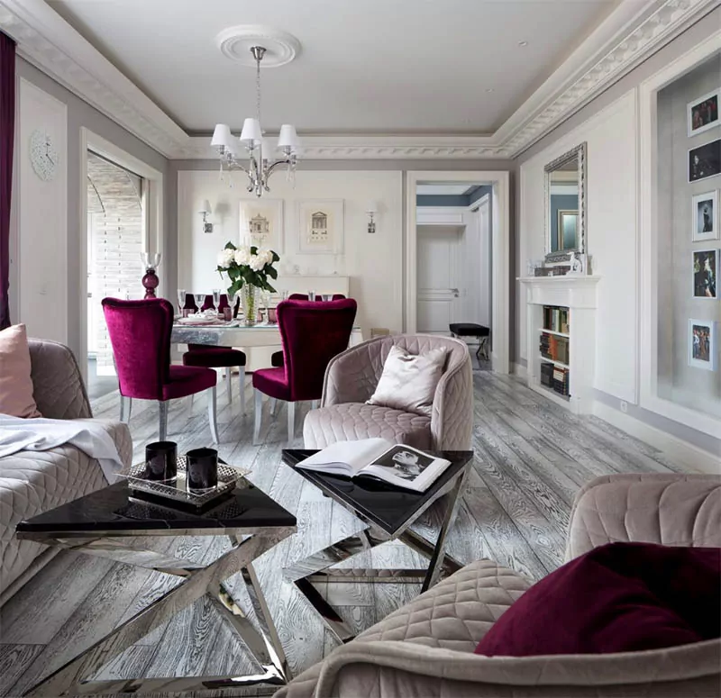 В гостиной решили соединить несочетаемое. Здесь интерьер выполнен в стиле неоклассика с ампиром. Комната получила визуальную границу на два пространства — обеденную и зону отдыха.