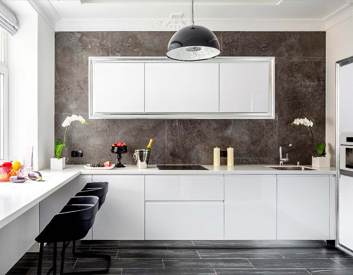 Минималистичная кухня. Здесь нет ничего лишнего. Все подчинено функциональности. Белые фасады кухни сочетаются с темным полом.