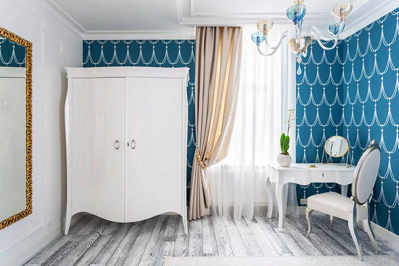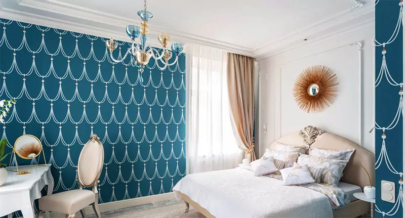 Спальня выполнена под мотивы моря. Голубые обои издалека смотрятся как волны. По центру установлена роскошная кровать на рельефных ножках.
