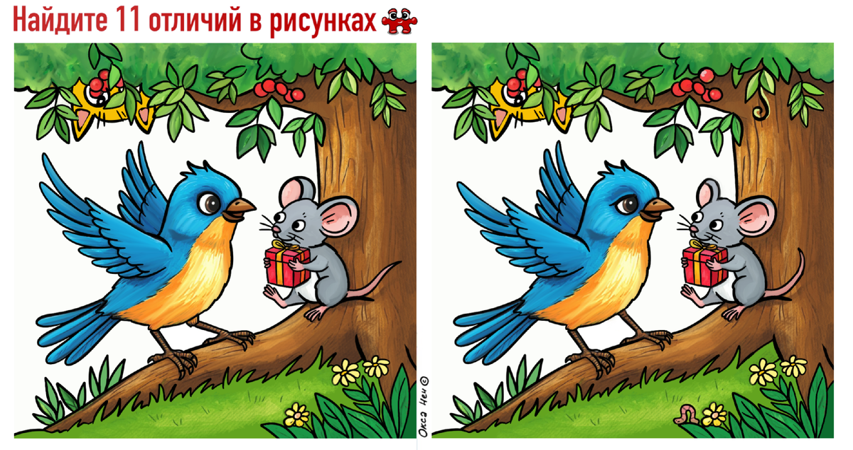 Рисунки милой птичкой и мышонком на ветке дерева сразу вызывают улыбку и умиление. Но авторы Дзен-канала «Журнал головоломок» разместили их не просто ради красоты и веселья, а чтобы проверить внимательность и сосредоточенность.