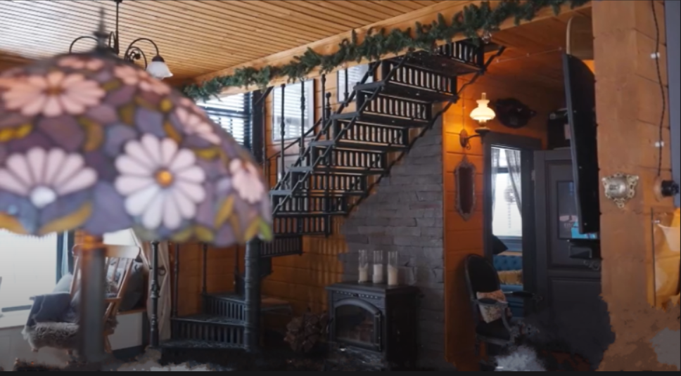 Здесь же есть настоящая печь. Ее топят регулярно. Невозможно не заметить лодку на потолке, которая служит светильником. В доме вообще нет никакого яркого света, но множество световых источников.