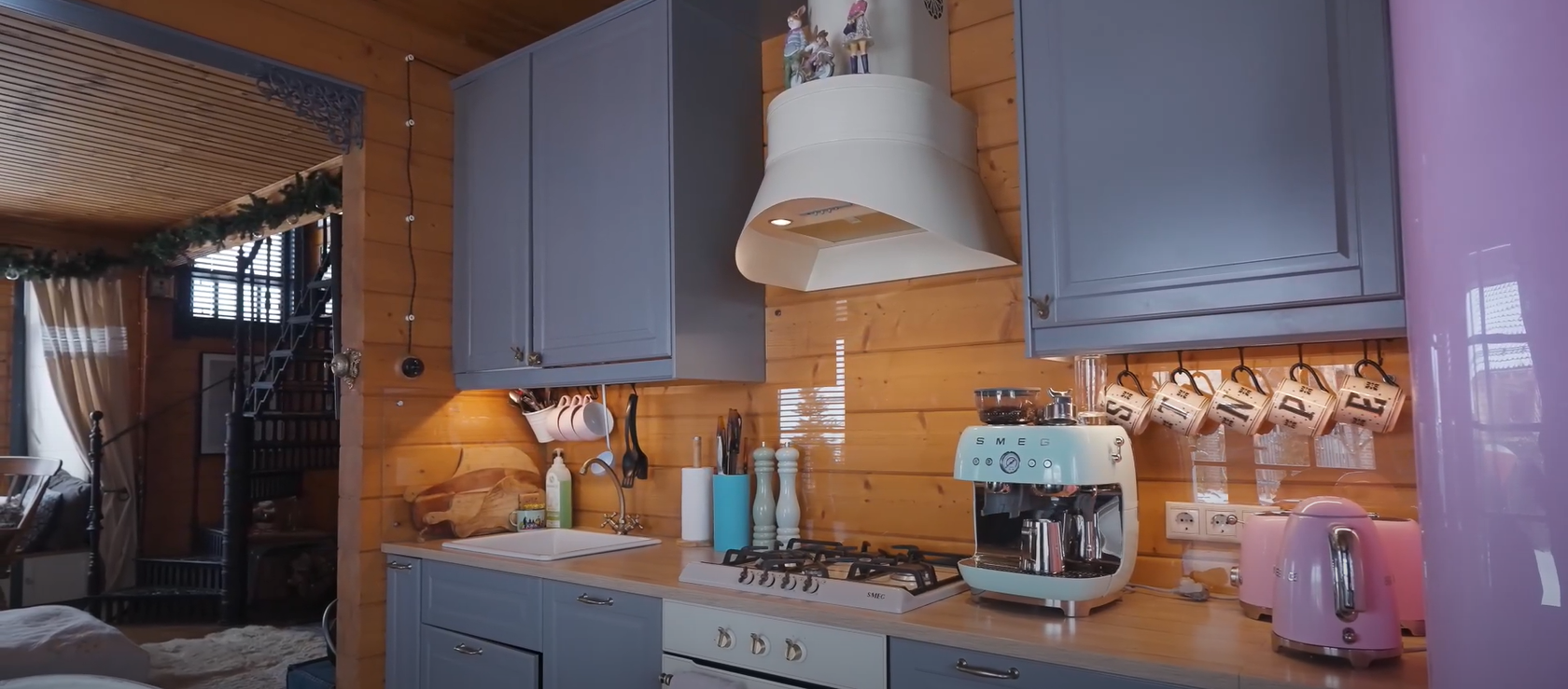 Начнем с того, в доме везде изображения зайцев. Они и в виде статуэток, рисунков и даже на подушках. Гостиная объединена с кухней. Здесь собирается вся семья. В глаза бросается чугунная винтовая лестница.