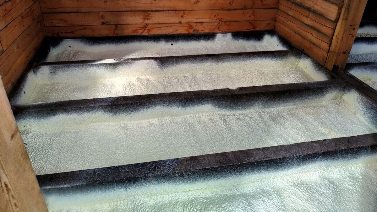 Сначала монтируем черновой и проветриваемый снизу пол. Это обычная фанера, которая крепится снизу к заранее смонтированным балкам нужной толщины. Балки устанавливаем ребром. Тогда наши отсеки под минеральную вату будут более глубокими. Вопрос промерзания в местах монтажа балок полностью исключен. Далее заполняем все щели и укладываем брикетированную минеральную вату.