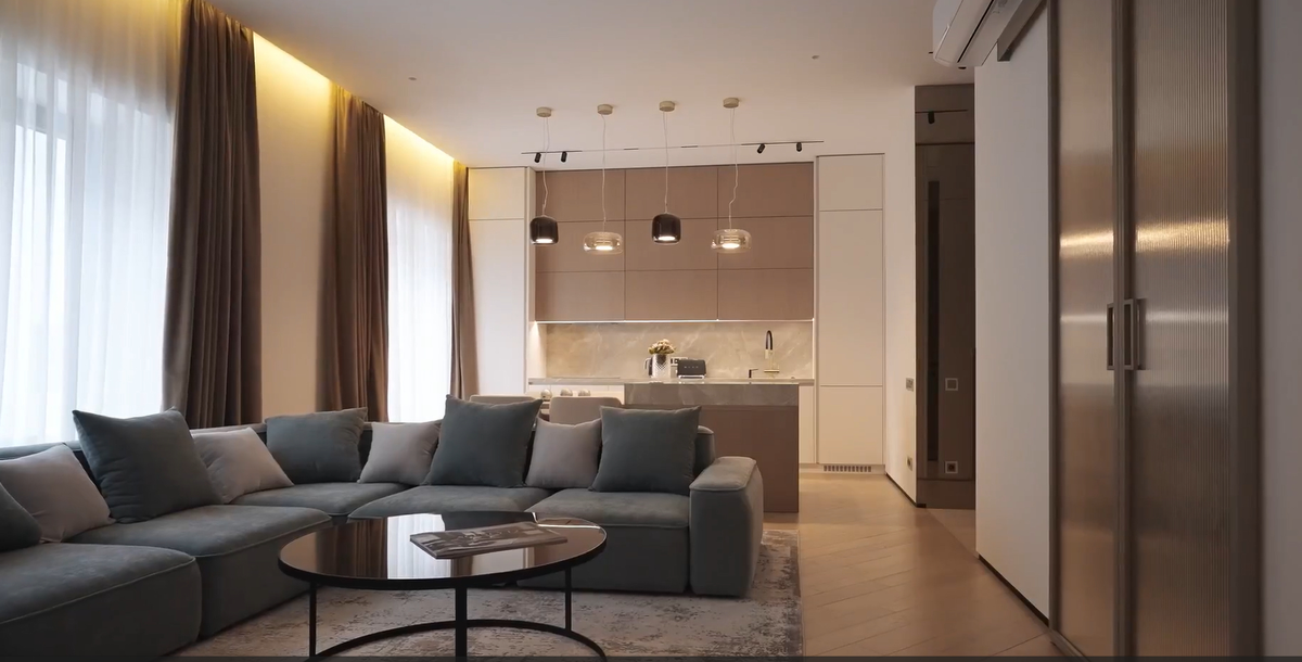 Кухню решили совместить с гостиной. Очень лаконичный дизайн. Отметим выбор керамогранита.