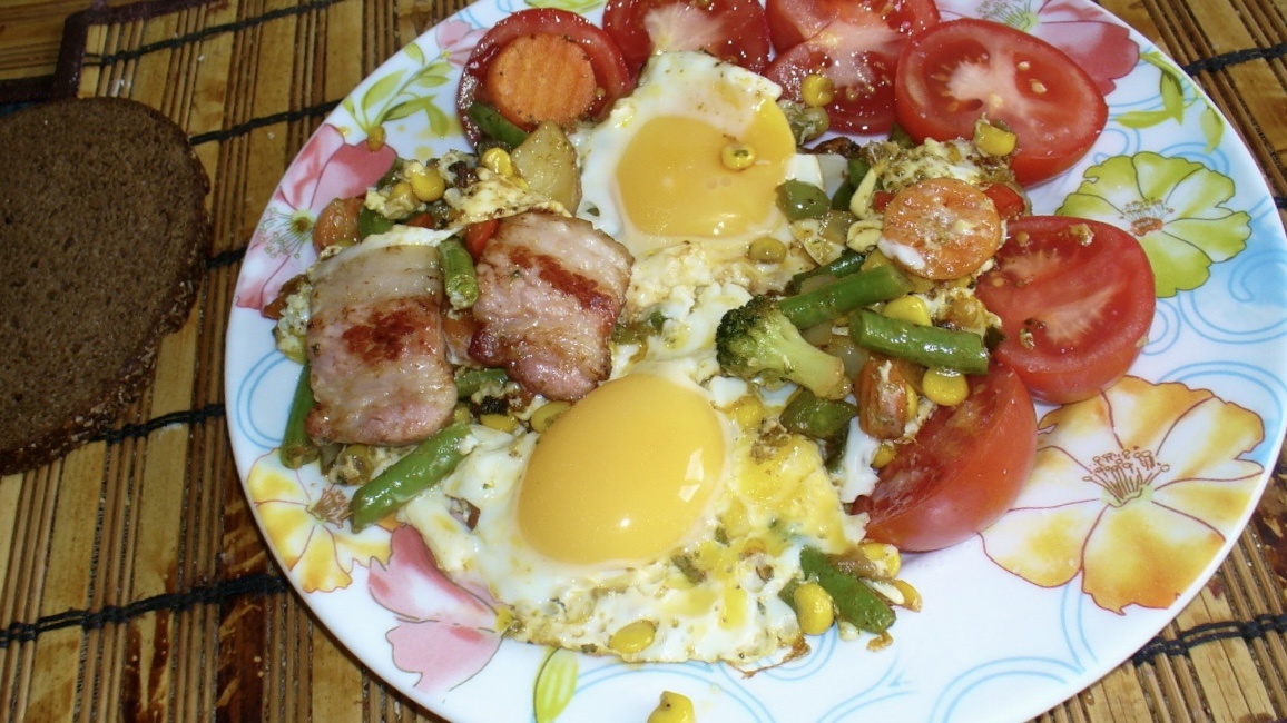 Омлет. Классический завтрак. Выбираем вариант омлета на пару или в духовке. При желании сверху натираем нежирный сыр.