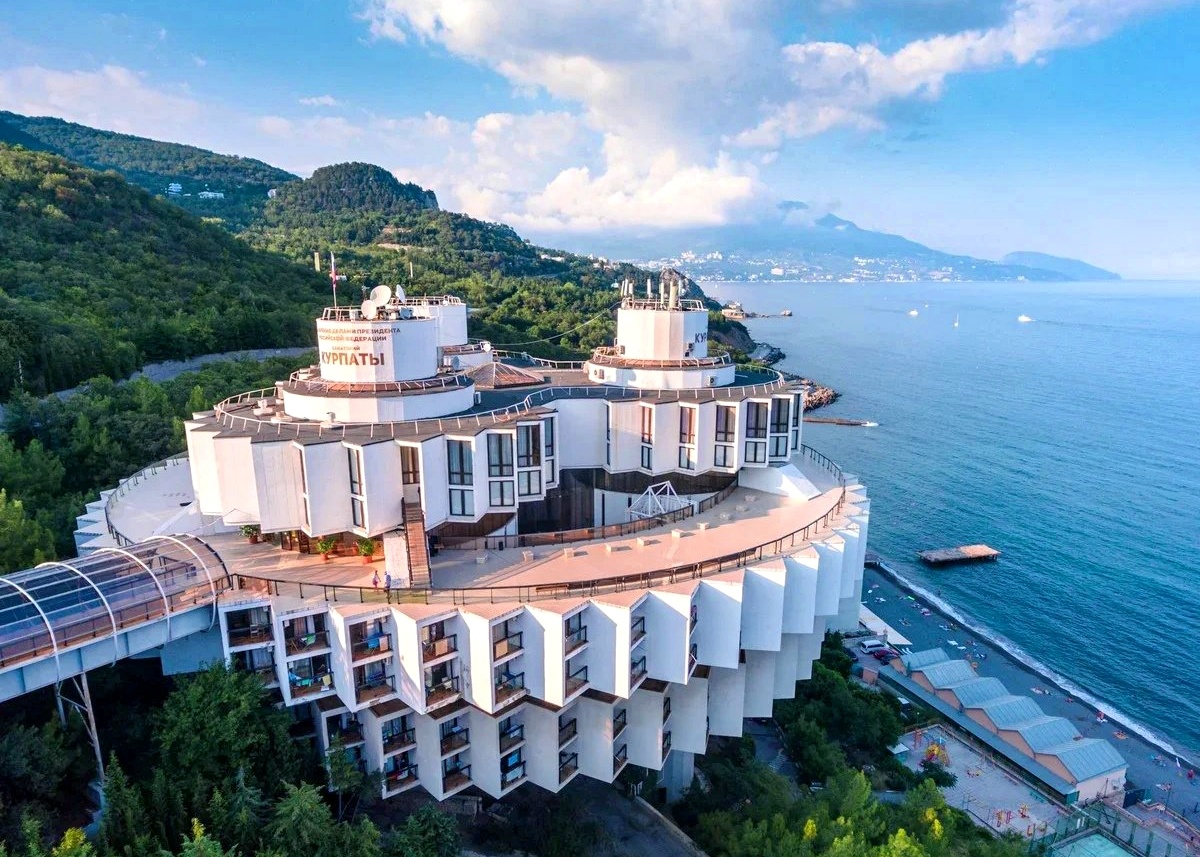 Международный пансионат «Дружба» в Ялте. Здание напоминает гигантский космический корабль. Проектом занимался архитектор Игорь Василевский. Здесь было использовано конструктивное решение, где нет несущих и несомых элементов.