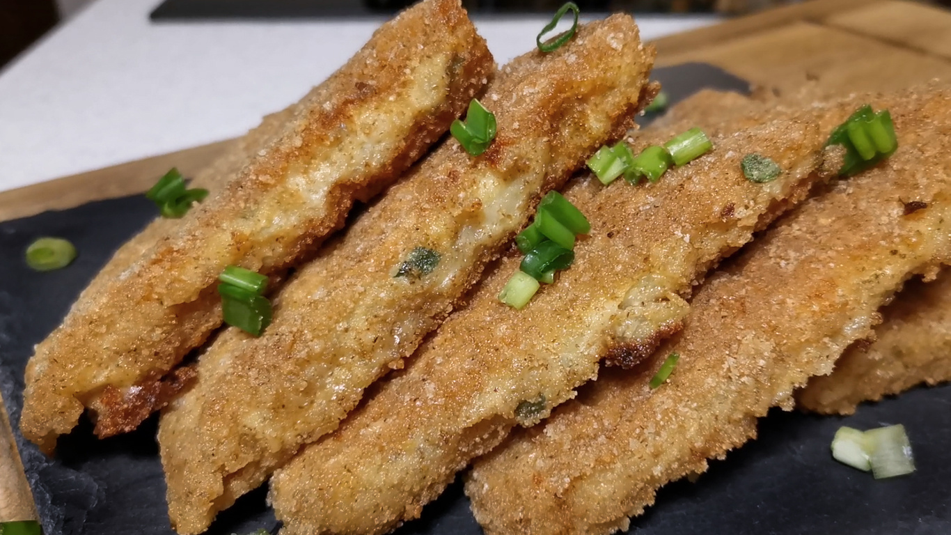 Берем вафельные коржи. На корж выкладываем начинку, а другим коржом накрываем. Надавливаем и разрезаем на шесть частей. Каждый такой треугольник обмакиваем в яйце и обваливаем в панировочных сухарях. Далее жарим на растительном масле по пять минут каждую из сторон. Блюдо готово.