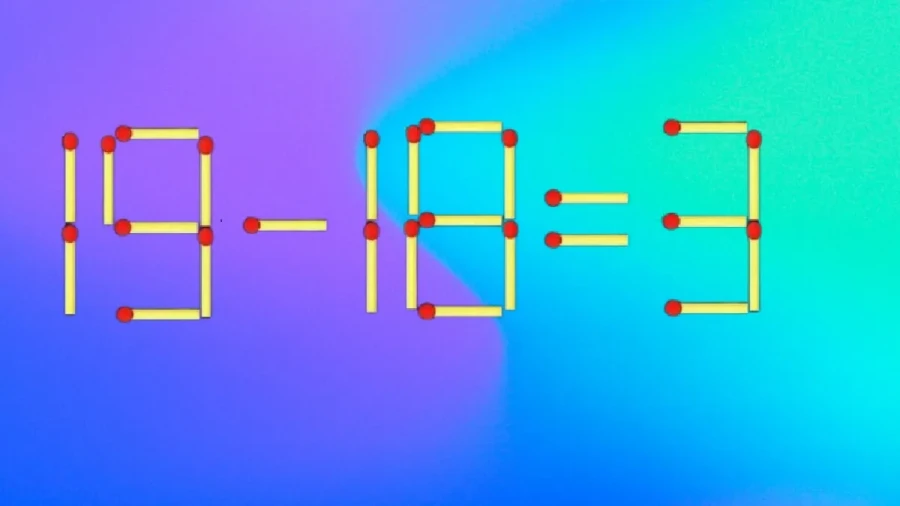 На картинке представлен интересный пример. Из спичек составлено равенство «19-18=3», но оно неверное. Необходимо переставить всего одну спичку, чтобы вычисления стали правильными.
