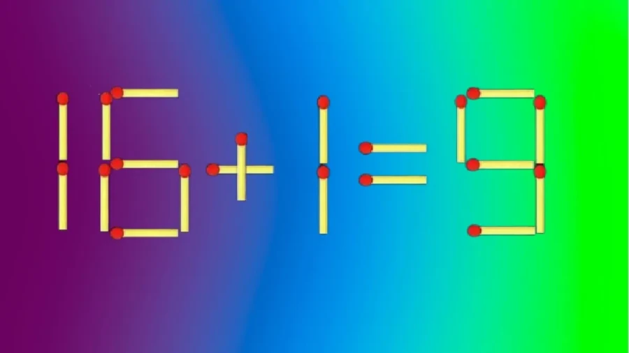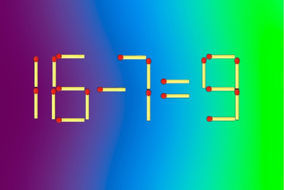 Перед вами пример, в котором составлено равенство «16+1=9». Очевидно, что запись содержит ошибку, и исправить её можно всего одним движением. Достаточно изменить расположение лишь одной спички.
