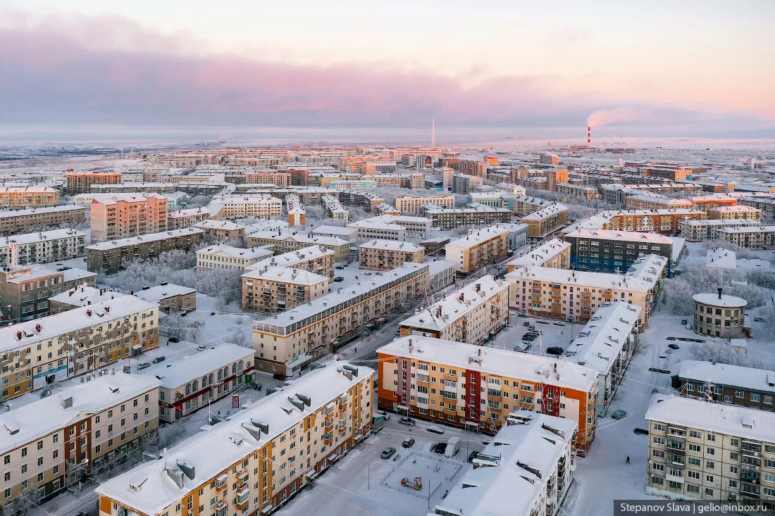 Норильск. Здесь нет автодороги на Большую землю. Построить здесь дорогу сравнимо с работой по полету в космос. Температура зимой опускается ниже -55 градусов, а летом грунт становится подвижным.