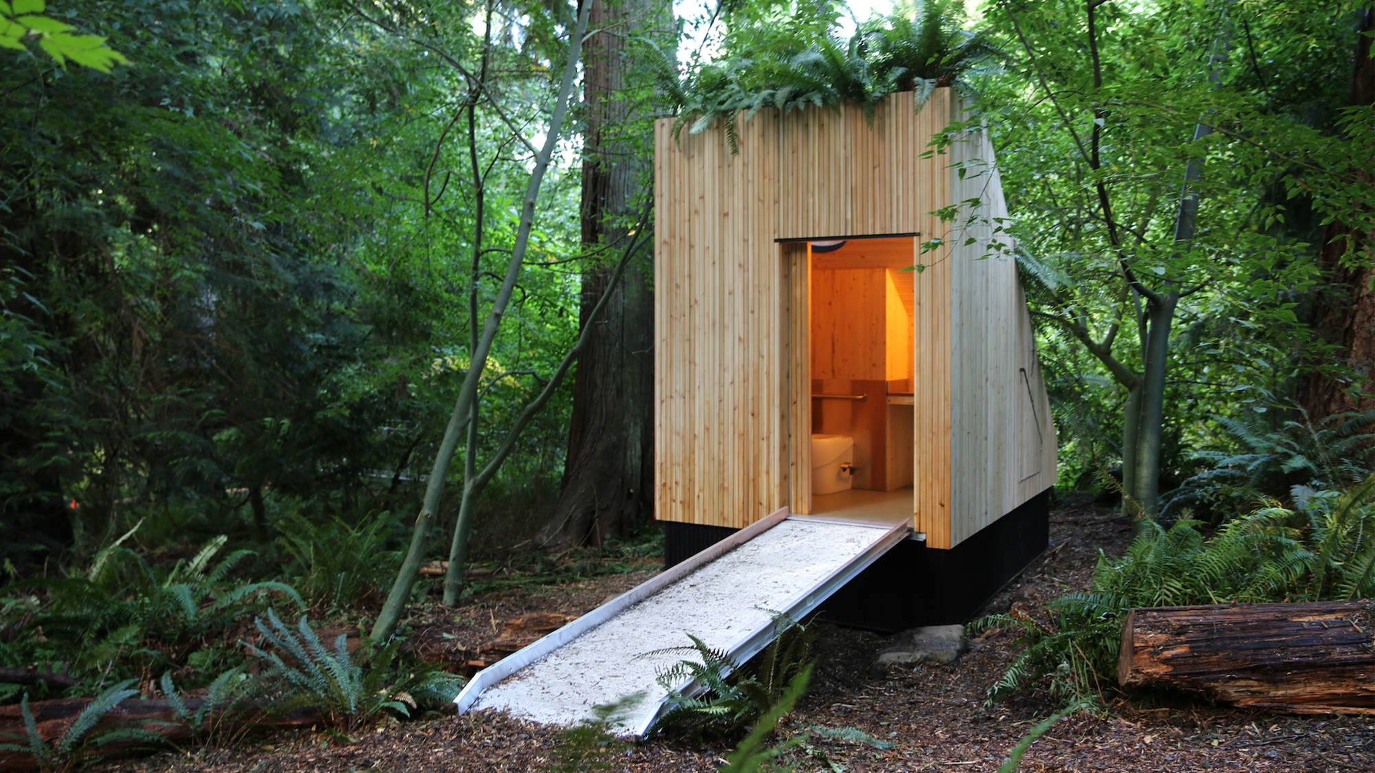 Конструкция состоит из деревянных панелей, оснащенных устойчивой к гниению и антимикробной кедровой внешней поверхностью, зеленой крышей и маломощным вентилятором для циркуляции воздуха. Система отделяет твердые отходы от жидких отходов, и твердые вещества направляются в отсек, выстланный мицелием. Внутри микробы превращают твердые отходы в компост, а грибы поглощают неприятные запахи.
