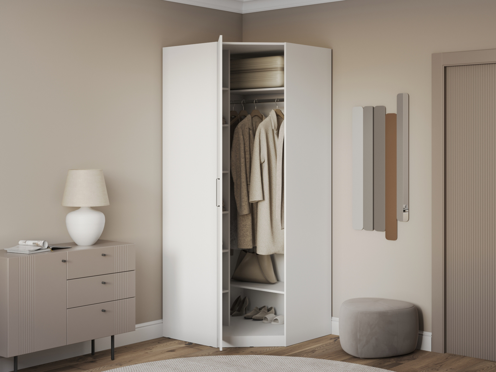 Угловой шкаф отлично подойдет и в спальне. Здесь можно удобно хранить повседневный гардероб и постельные принадлежности. Такой шкаф впишется и в гостиную. Хранить будем книги, различные мелкие аксуссуары.