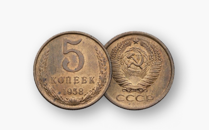 Почетное первое место занимает монета со стоимостью свыше 360 тысяч рублей. И это легендарные 5 копеек 1958 года. Она сама по себе является отличительным признаком, так как вообще не должна была выйти в использование, однако вышла благодаря ошибке монетного двора.