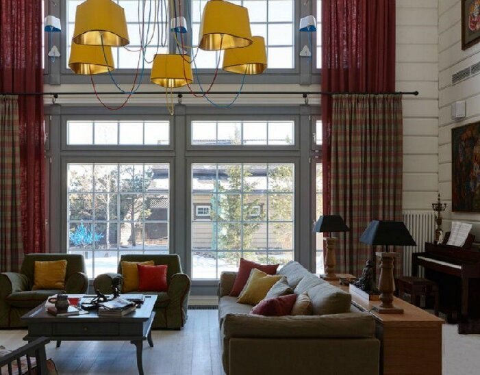 При входе в дом сразу оказываешься в просторной гостиной. Она очень светлая за счет большого количества естественного света, который проникает сюда через огромные окна. Гостиная получила спокойные тона. Для большей живости установлены оригинальные светильники.