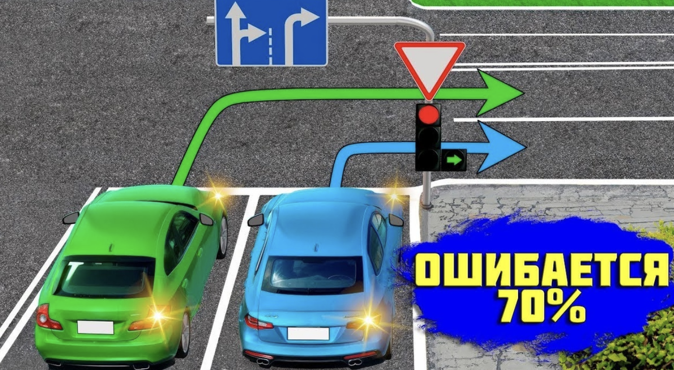 На канале «Автолюбитель. Задачи по ПДД» рассказали одну задачку. Два авто подъехали к перекрёстку, и оба автомобиля хотят повернуть направо. При этом над полосами висит знак 5.15.1, и он разрешает поворот направо с обеих полос. Также есть знак «Уступите дорогу» и светофор с зелёной стрелкой вправо при красном основном сигнале.