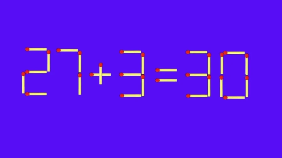 На рисунке изображено равенство «27+3=30». Всё верно, но задача — переставить всего одну спичку. Вычисления при этом должны остаться правильными.