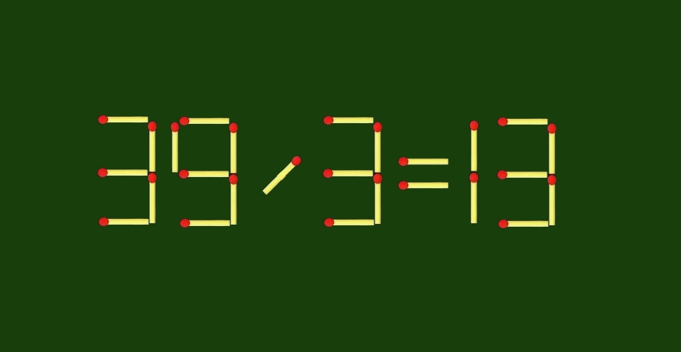 Ключ к решению — посмотреть на действие и лишние троечки. Достаточно превратить умножение в деление и одно «3» превратить в «9». В результате получается аккуратное и правильное равенство: 39/3=13.