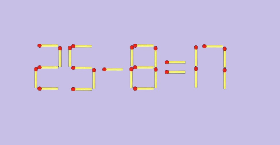 Решение несложное: одну палочку убирают из первой девятки, превращая «29» в «25», а из второй «9» делают «8». В итоге получается корректная запись — 25−8=17.