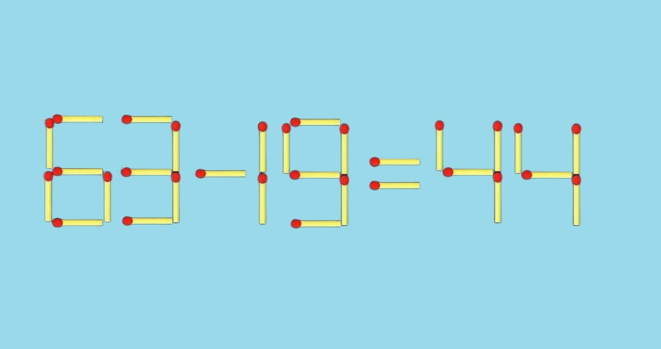 Мы пошли тем же путём: из восьмёрки сделали девятку, а лишнюю спичку добавили к первой цифре. Если вы все сделали верно, то у вас получится правильное равенство «63-19=44».