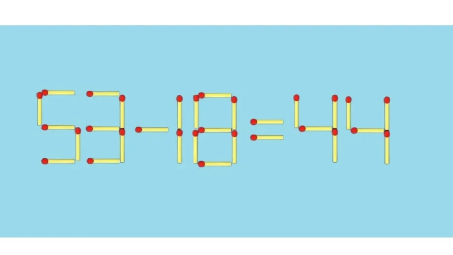 Перед вам картинка с примером «53-18=44». Сразу видно, что в нем глупейшая ошибка. Но достаточно передвинуть всего одну спичку, чтобы всё стало на свои места.