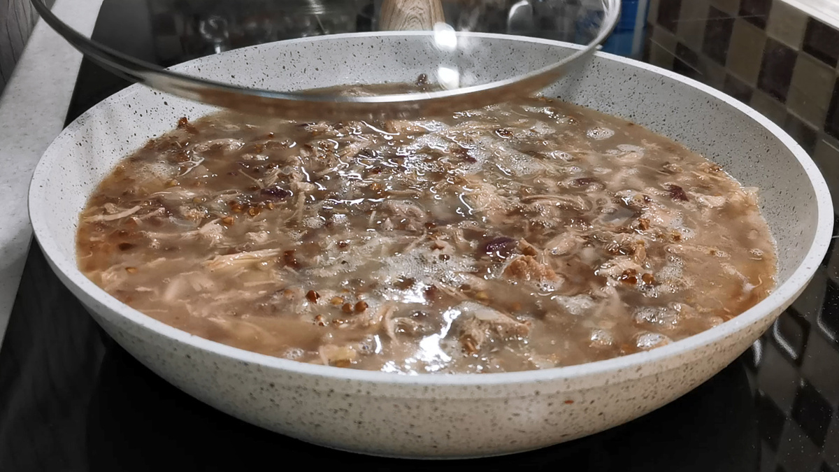 Далее кладут две крупы — рис и гречку, в сухом виде, предварительно хорошо промытые. Всё перемешивается, солится и перчится по вкусу, а затем заливается водой так, чтобы полностью покрыть ингредиенты с небольшим запасом. Лучше использовать горячую воду, но можно и холодную — разницы почти нет.