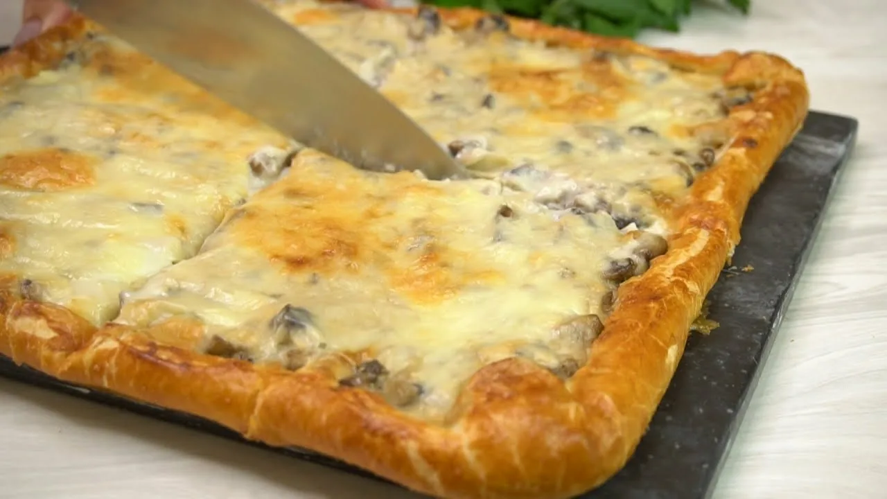 Возиться с тестом не будем. Воспользуемся готовым слоёным тестом, которое надо раскатать в прямоугольник. Равномерно распределяем начинку. Возьмите любой сыр твёрдых сортов и натрите на крупной тёрке. Сыром посыпаем пирог.