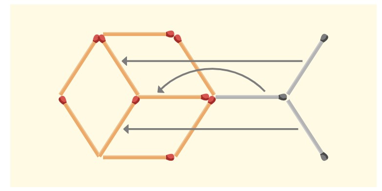 На рисунке показана фигура из спичек. Задача состоит в том, чтобы переместить три спички так, чтобы получилось три ромба. Убирать их нельзя — только переставить.